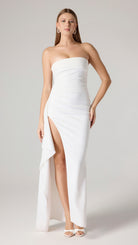 Vücudunuza mükemmel uyum sağlayan lüks çift streç krepten üretilen zamansız maksi elbisemiz Taranto ile kendinizi bir siren gibi hissedin. Straplez yaka detaylara sahip bu gösterişli görünüm, uyluk yüksekliğinde bir yırtmaç ve bir tarafta drape fırfırına sahiptir.